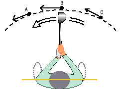南を向いてまっすぐ立って長い棒で運動場に反時計回りで円を描く事を考えて下さい。この軌道の中で、東を向いているのはどこでしょうか。そうです、自分のまっすぐ正面(真南)ここ1点しかありません。ドライバーのように長いクラブは、まさに運動場に円を描いているようなものです。正面より右よりの部分の軌道は当然狙う方向より右に向いていますよね。逆に正面より左の部分の軌道は左を向いています。もし軌道を右に向かせたいときは、ボールを右に置く、左に向かせたいときは左におけば、軌道の修正はできます。ただしこれは応急処置であり、本来はアウトサイドインを直す事です。(これは大変難しいことですが・・)