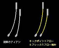 キックポイントフロー&フレックスフロー設計 キックポイントだけをフロー設計にしても、ロングアイアンほどシャフトが 柔らかく感じてしまいます。そこでロングアイアンになるほどシャフトの たわみを抑えたフレックスフロー設計(番手により硬さが変わる) を採用。ロングアイアンでもショートアイアンでも同じ フィーリングを実現させました。